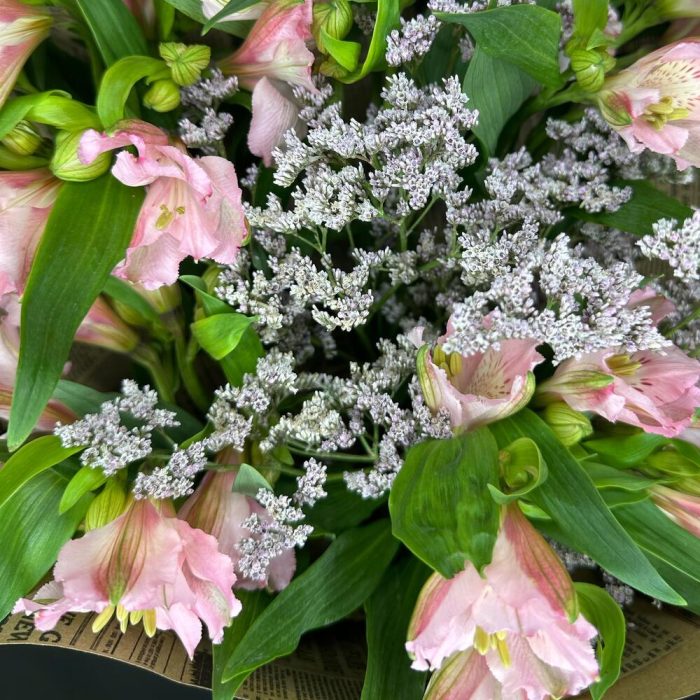 Альстромерия – 5 шт.Лимониум – 2 шт.Лента атласная – 1 шт.Упаковка дизайнерская – 1 шт.