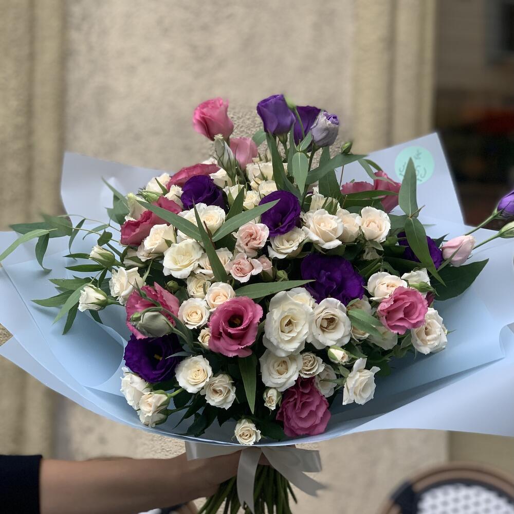 white spray rose – 10 шт. pink eustoma – 5 шт. purple eustoma – 5 шт. Eucalyptus – 10 шт.