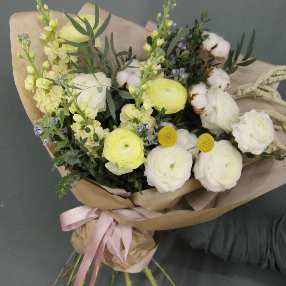 Ранункулюс – 6 шт.Маттиола – 5 шт.Твидия – 4 шт.Хлопок – 3 шт.Амарант – 2 шт.Краспедия – 2 шт.Эвкалипт – 7 шт.Упаковка – 3 шт.Лента атласная – 1 шт.