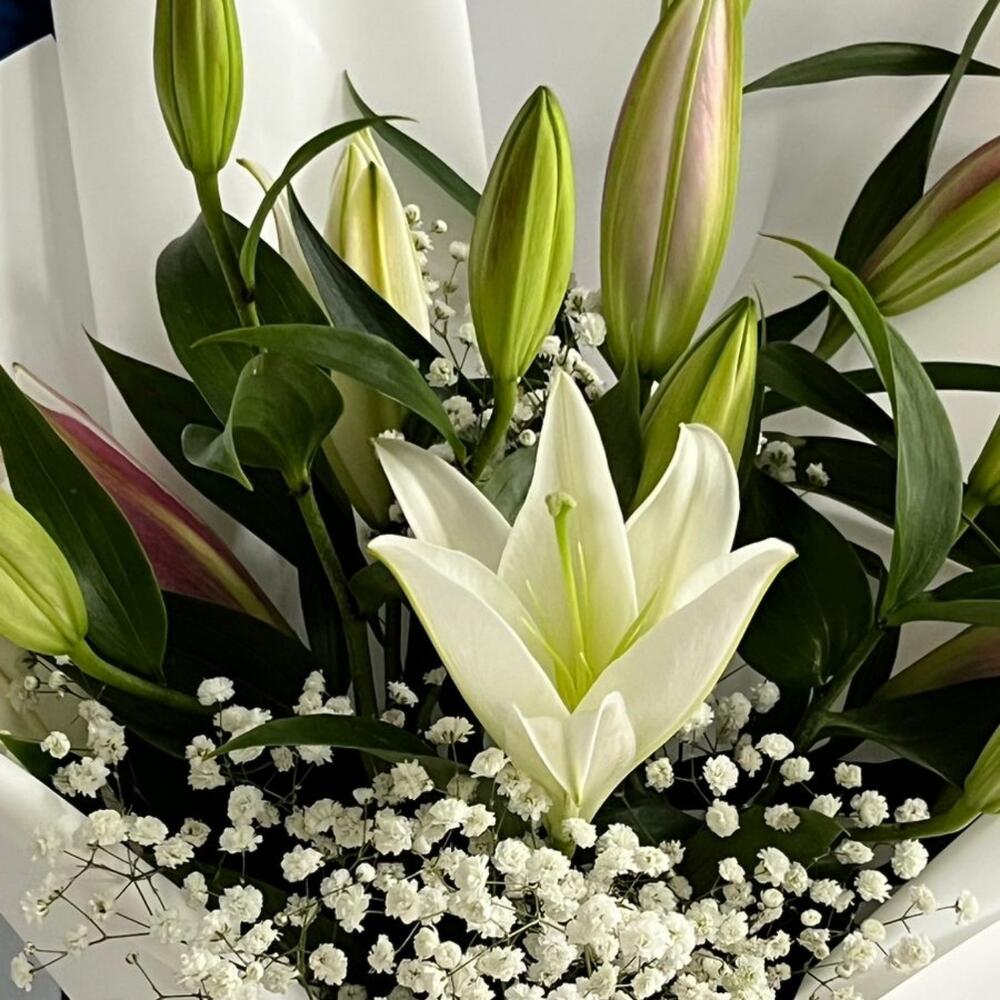Букет из 3 лилий и гипсофилы в упаковке