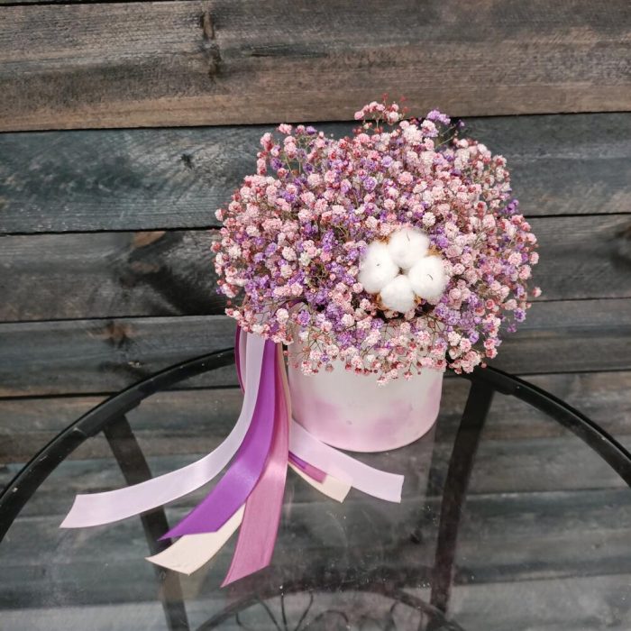 “Сиреневый туман” – композиция из гипсофилы в шляпной коробке