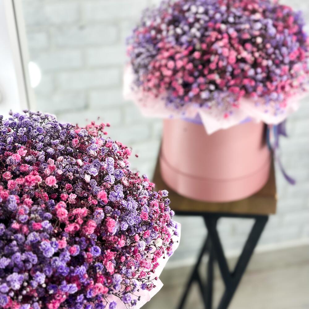 Тишью – 3 шт.Открыточка с вашими пожеланиями – 1 шт.Средство для продления жизни цветов – 1 шт.инструкция по уходу за цветами – 1 шт.гипсофила радужная – 15 шт.шляпная коробка с лентами и оазисом – 1 шт.