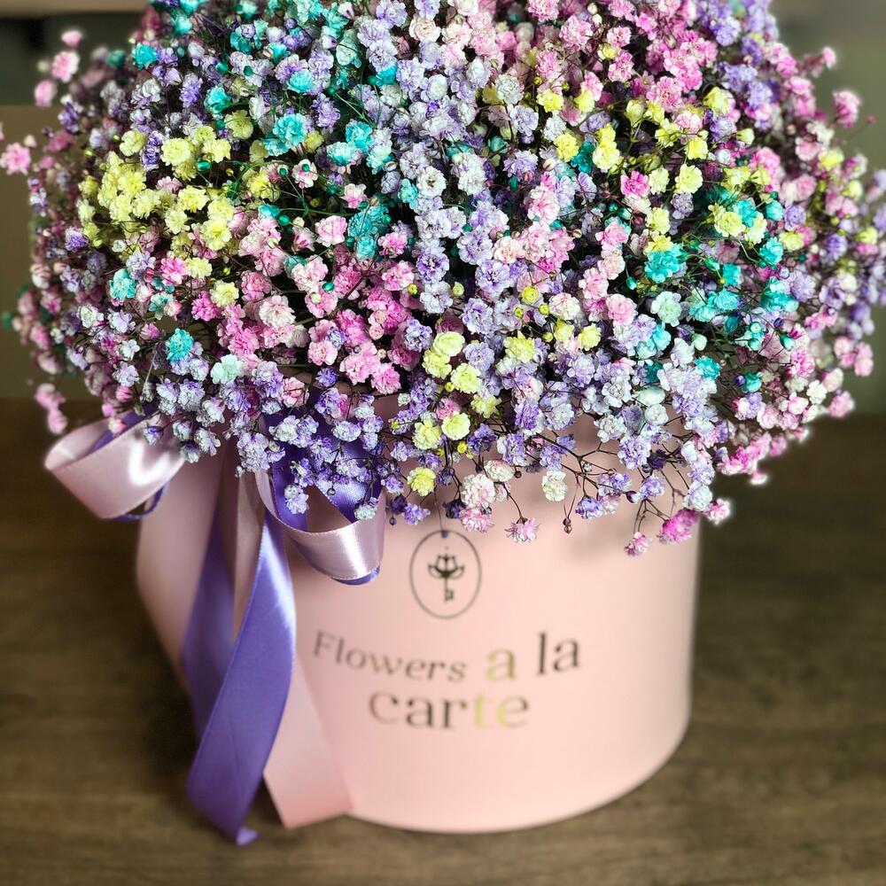 Коробка шляпная – 1 шт.Оазис флористический – 1 шт.Лента атласная – 2 шт.гипсофила радужная – 11 шт.