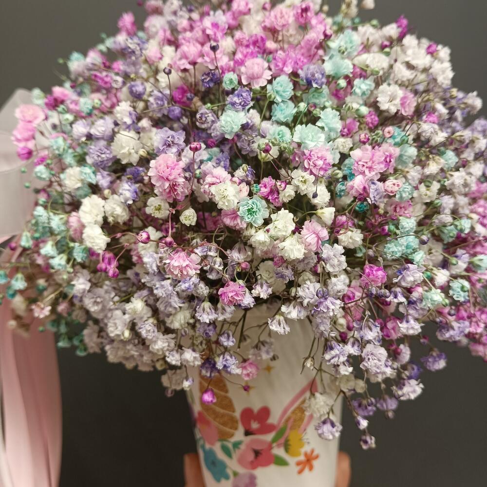 Гипсофила – 6 шт.Лента атласная – 2 шт.Оазис флористический – 1 шт.Стакан декоративный – 1 шт.