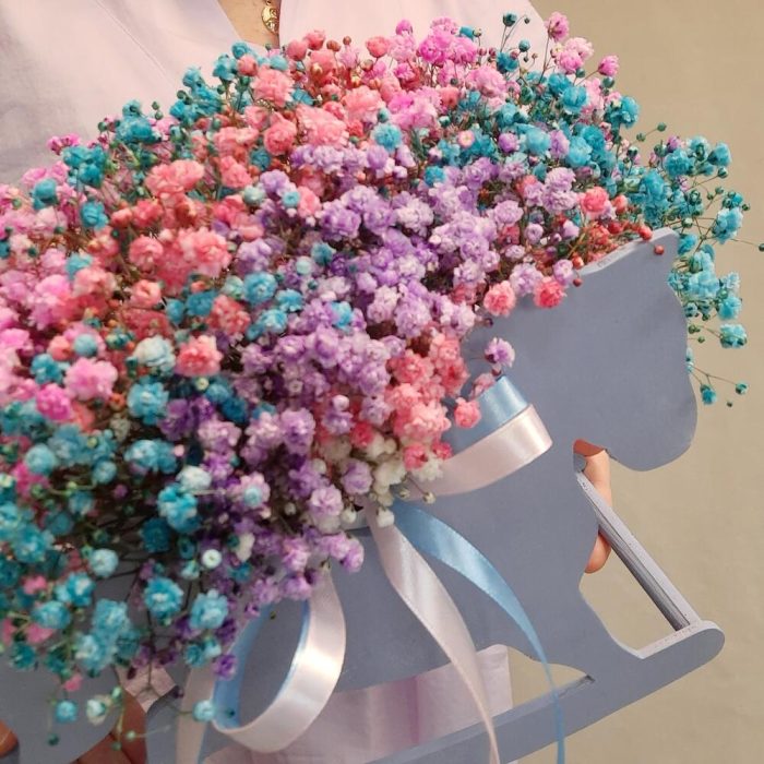 гипсофила радужная – 7 шт.Оазис флористический – 1 шт.Ящик деревянный – 1 шт.Лента атласная – 2 шт.