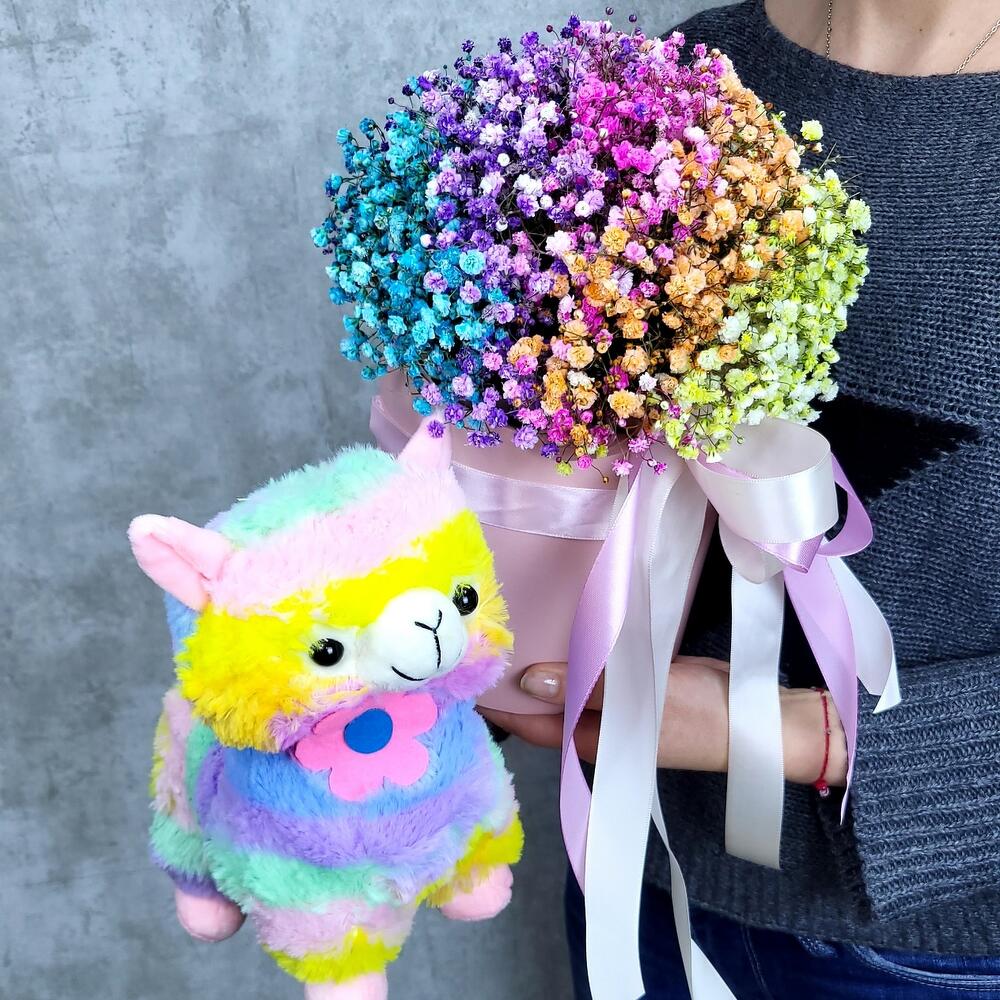 Гипсофила – 6 шт.Мягкая игрушка – 1 шт.Шляпная коробка – 1 шт.