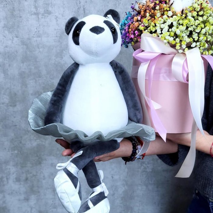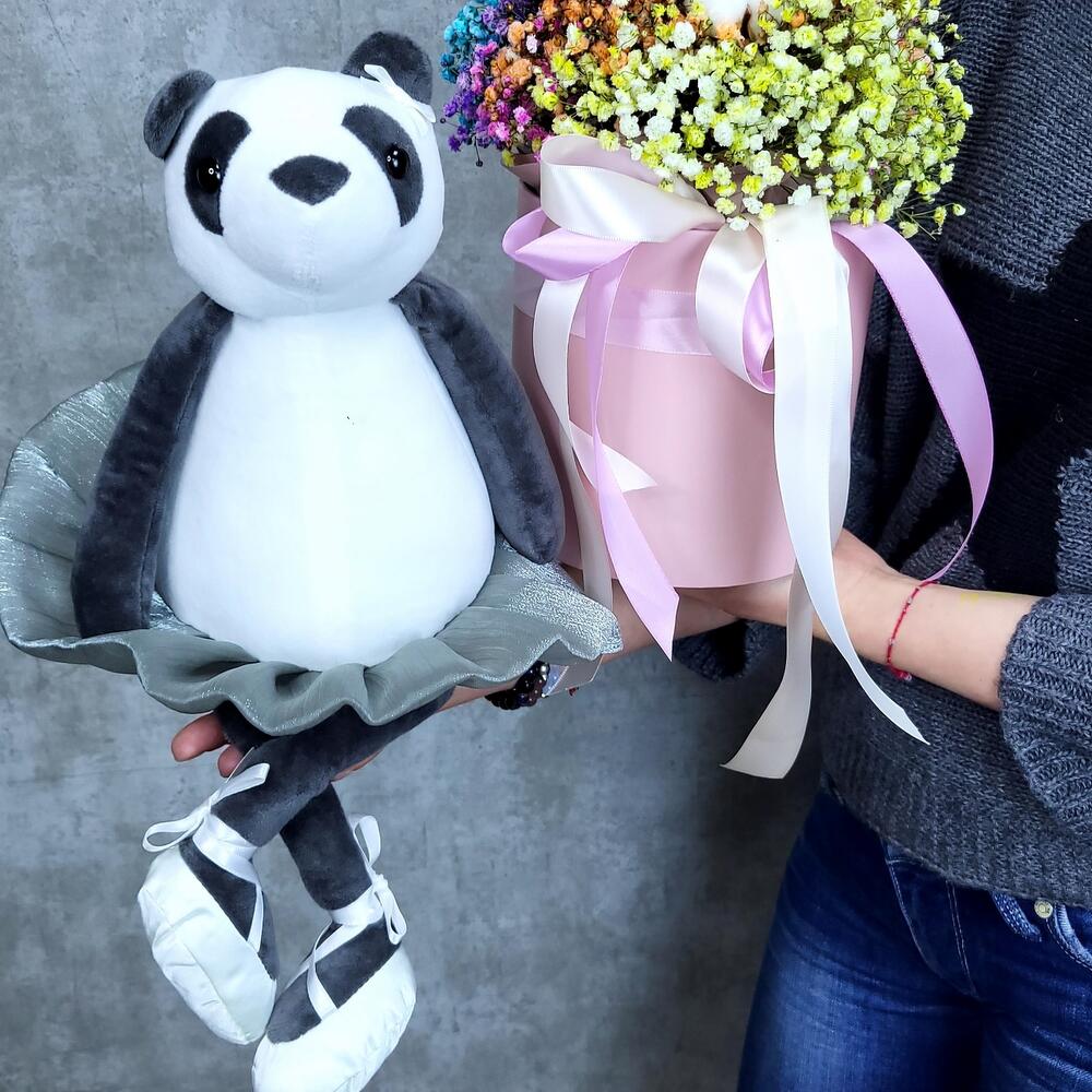 Хлопок – 3 шт.Оазис – 1 шт.Шляпная коробка с лентами – 1 шт.Мягкая игрушка панда – 1 шт.гипсофила цветная – 6 шт.