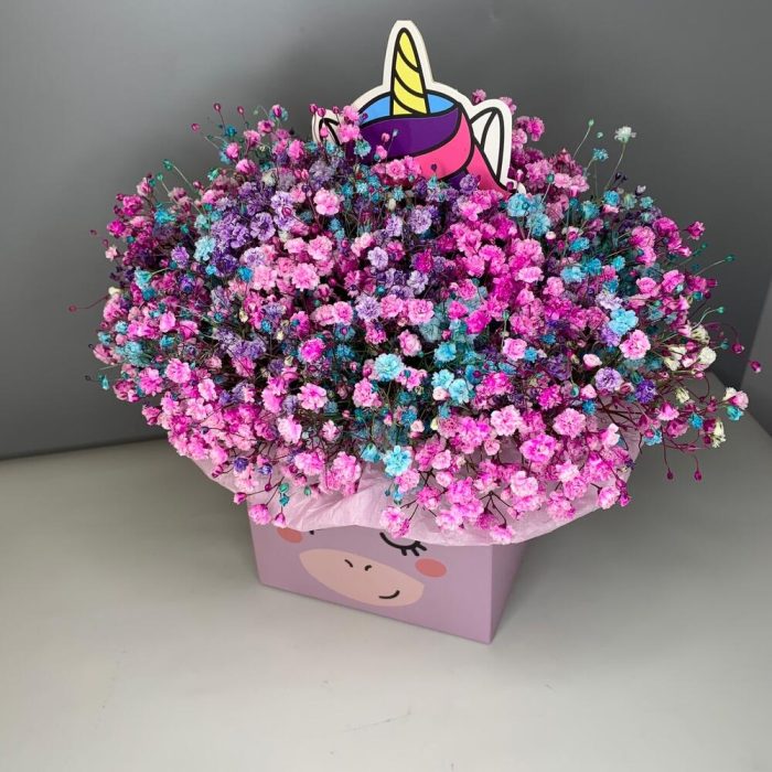 гипсофила радужная – 5 шт.Коробка – 1 шт.Тишью – 2 шт.Топпер – 1 шт.Пленка прозрачная – 1 шт.Лента атласная – 2 шт.