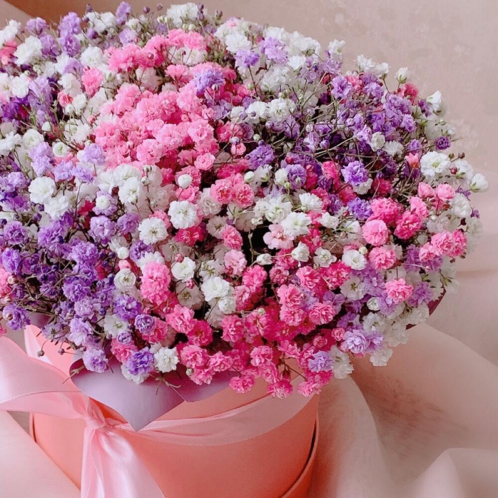 Радужная гипсофила в шляпной коробке