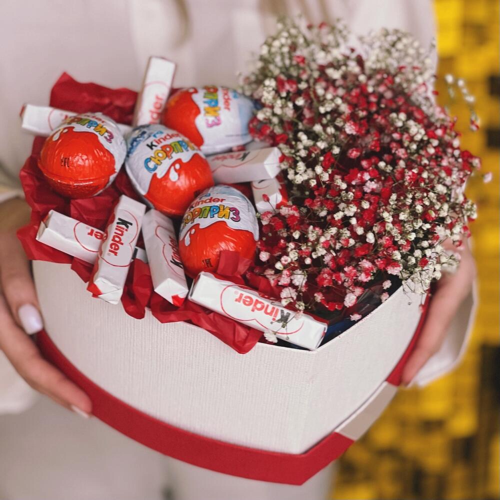 “Сладкое сердце ” – цветочная композиция с сладостями в коробке “Сердце”