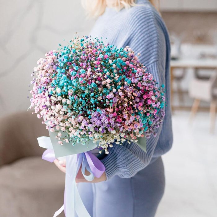 Лента атласная – 2 шт.Коробка шляпная – 1 шт.Оазис флористический – 2 шт.гипсофила радужная – 9 шт.