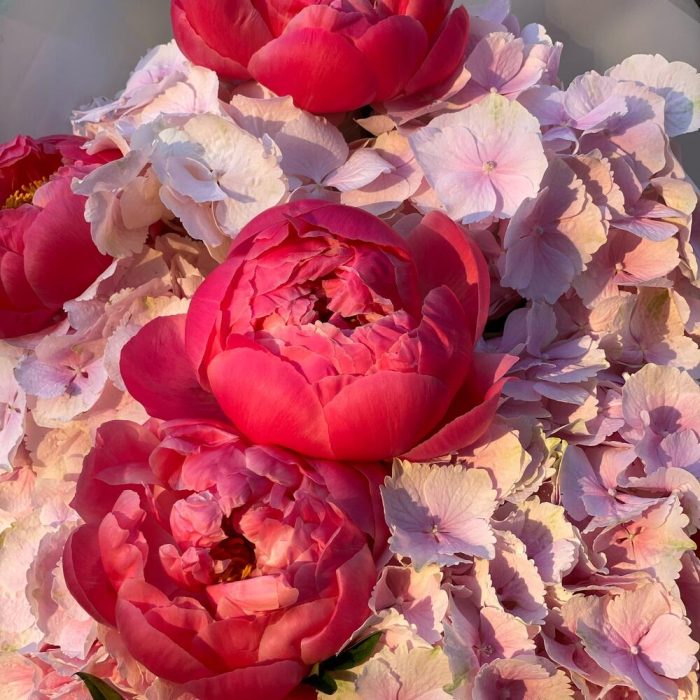Гортензия – 5 шт.Пион Коралл Шарм (Coral Charm) – 7 шт.Лента атласная – 1 шт.Фисташка – 2 шт.Упаковка дизайнерская – 5 шт.лента силиконовая брендированная – 1 шт.