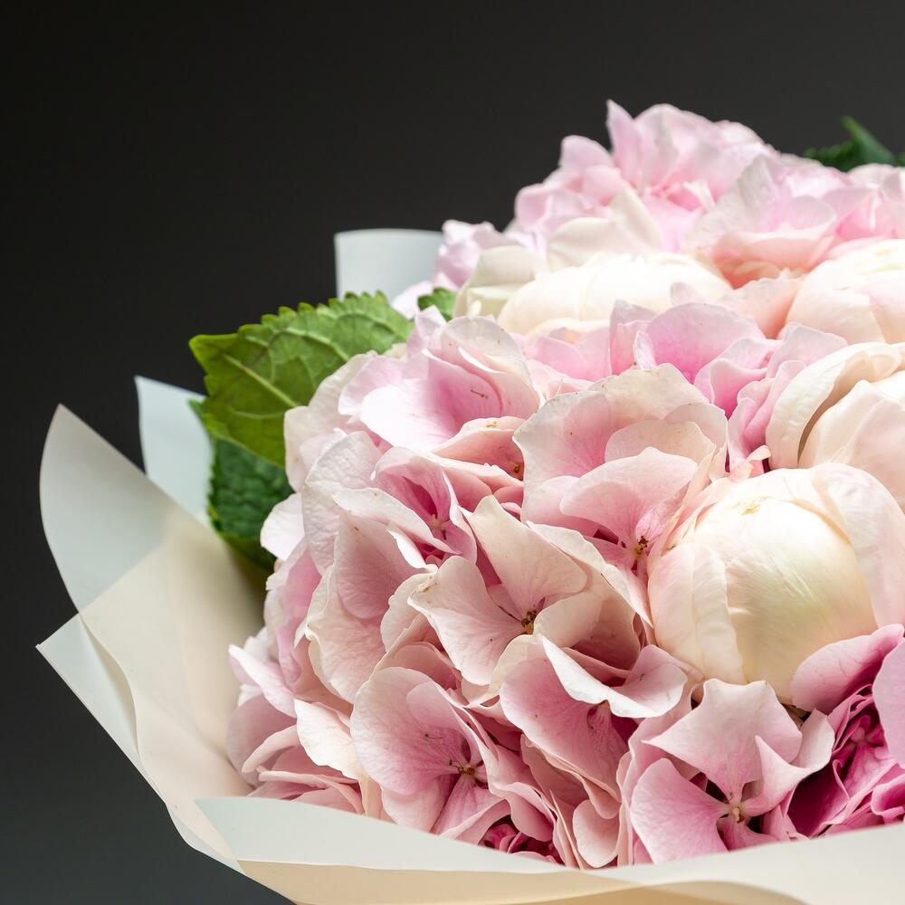 гортензия премиум розовая – 4 шт.пион белые премиум класса – 13 шт.Упаковка дизайнерская – 2 шт.хорошее настроение – 5 шт.Лента атласная – 3 шт.