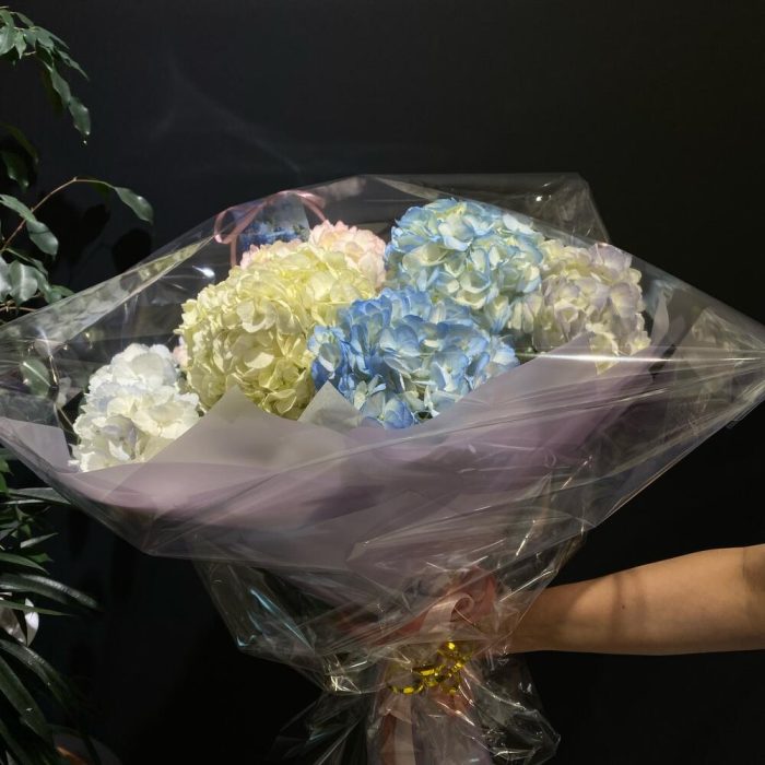 Гортензия – 11 шт. Лента атласная – 3 шт. Тишью – 4 шт. Слюда упаковка – 3 шт. салфетка декоративная – 5 шт.