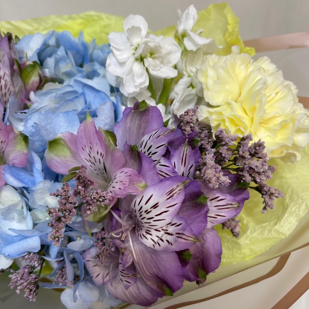 Гортензия голубая – 1 шт.Маттиола – 2 шт.Диантус – 3 шт.алсьтрамерия – 2 шт.Лимониум – 1 шт.