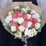 Роза – 9 шт.Альстромерия – 3 шт.Эустома – 2 шт.Фисташка – 3 шт.Крафт – 3 шт.Диантус – 6 шт.