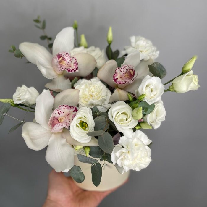 Белоснежная цветочная коробка с восхитительными орхидеями.