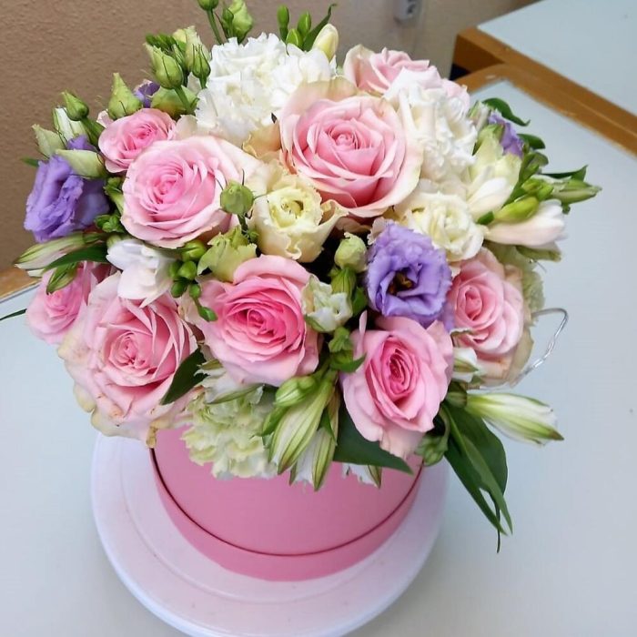 Альстромерия – 4 шт.Роза Эквадор – 9 шт.Гвоздика – 4 шт.Коробка шляпная – 1 шт.Вероника – 4 шт.Гирлянда – 1 шт.