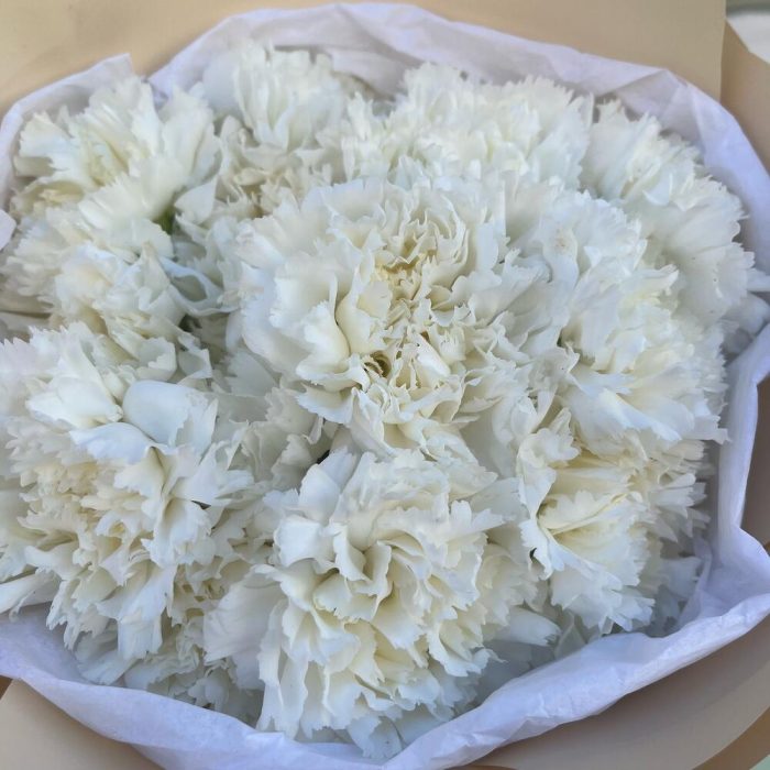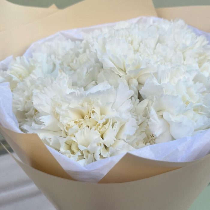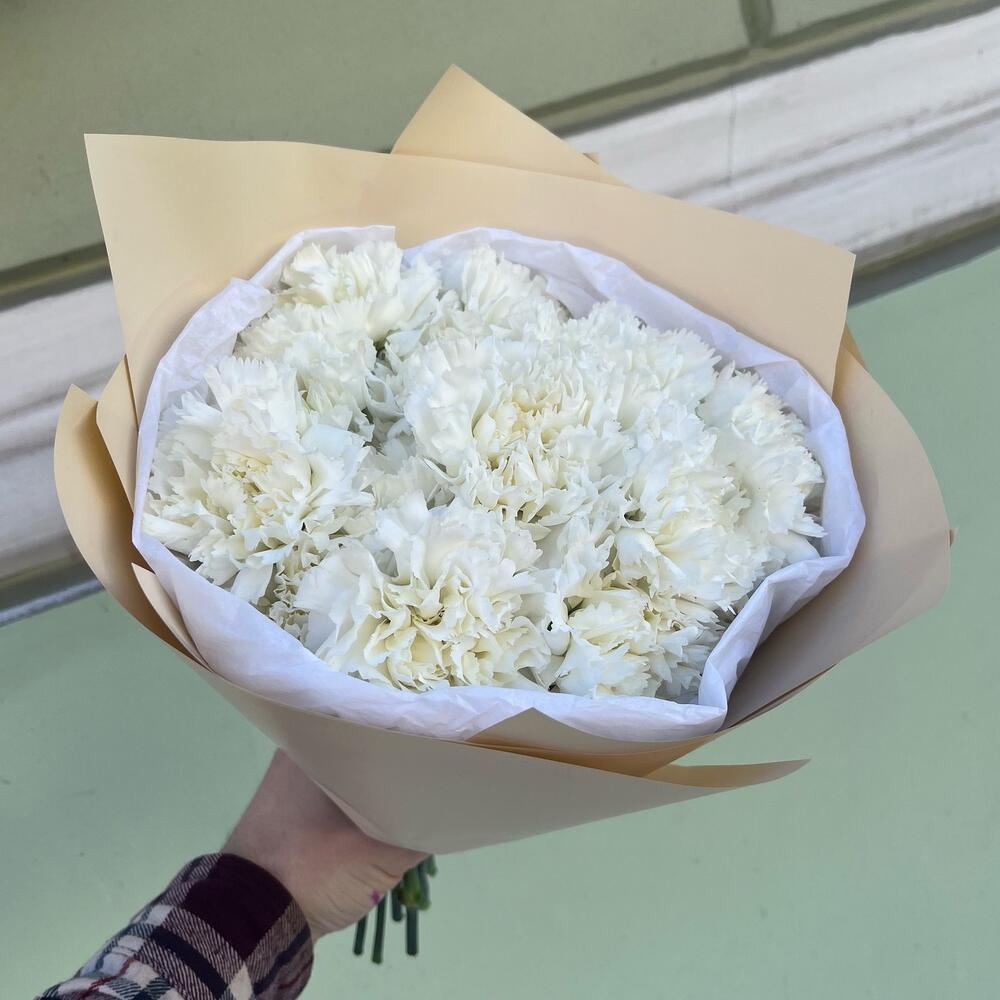 Тишью – 1 шт.Лента атласная белая – 1 шт.Диантус белый – 15 шт.Упаковка корейская пленка – 1 шт.