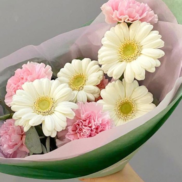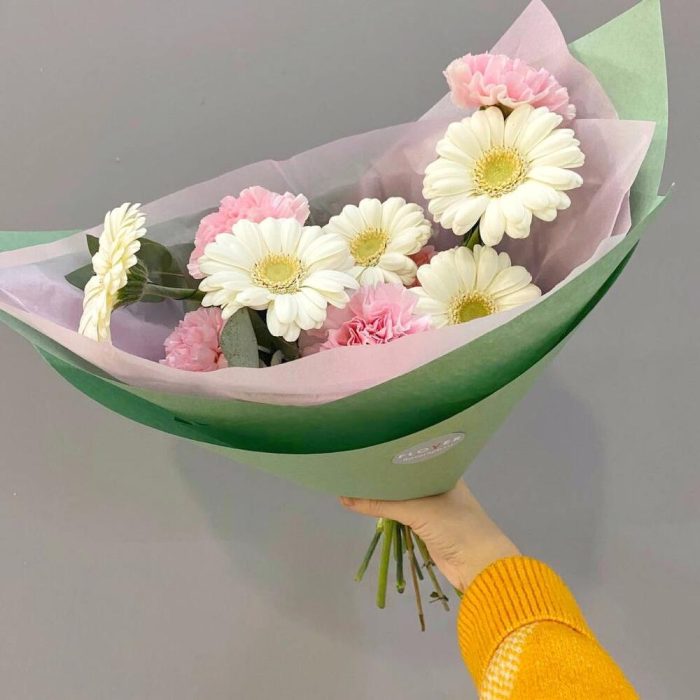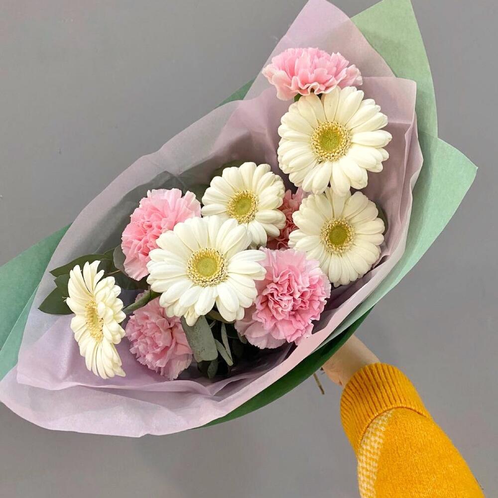 герберы – 5 шт.Диантус сортовой – 4 шт.Эвкалипт – 3 шт.Тишью – 2 шт.Крафт – 2 шт.