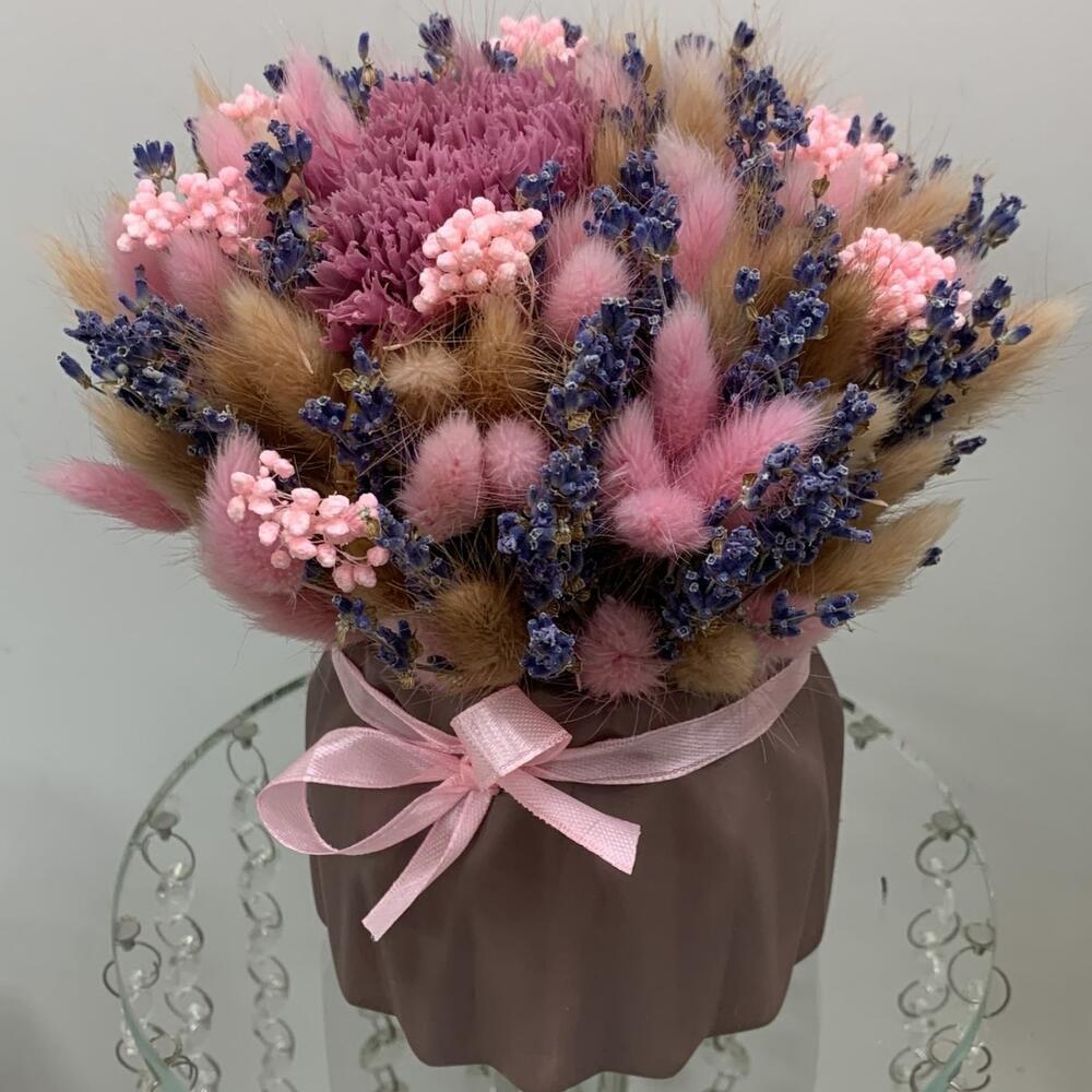 Ваза – 1 шт.гвоздика стабилизированная – 1 шт.Лаванда (сухоцвет) – 20 шт.Лагурус (сухоцвет) – 30 шт.сорго – 5 шт.