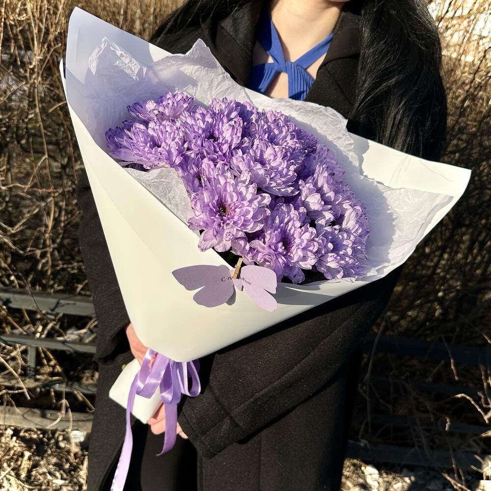 Лента атласная – 1 шт.Открыточка с вашими пожеланиями – 1 шт.Тишью белое – 2 шт.пленка матовая белая – 2 шт.хризантема кустовая крашенная фиолетовая – 5 шт.