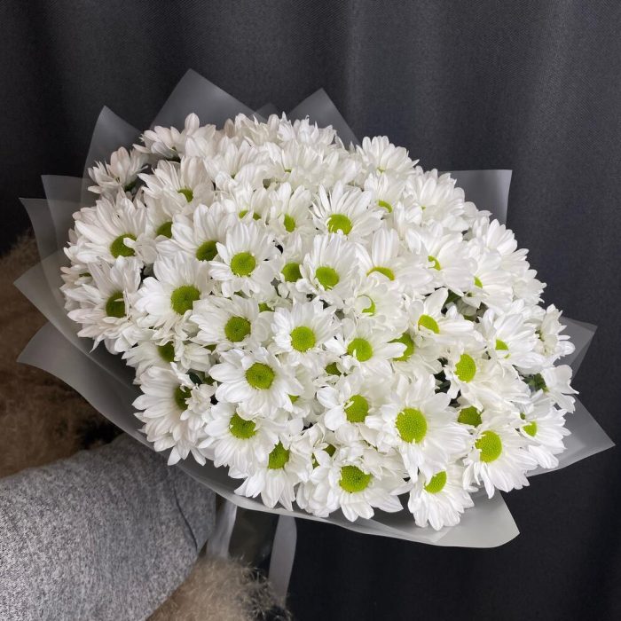 Хризантема кустовая – 15 шт.Дизайнерская упаковка – 1 шт.Лента атласная – 1 шт.