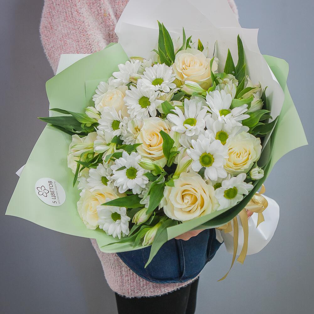 белые розы – 7 шт.белая хризантема – 3 шт.Альстромерия белая – 9 шт.