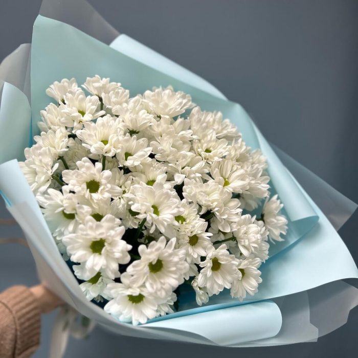 Кустовая хризантема – 9 шт.Упаковка – 2 шт.Лента атласная – 1 шт.
