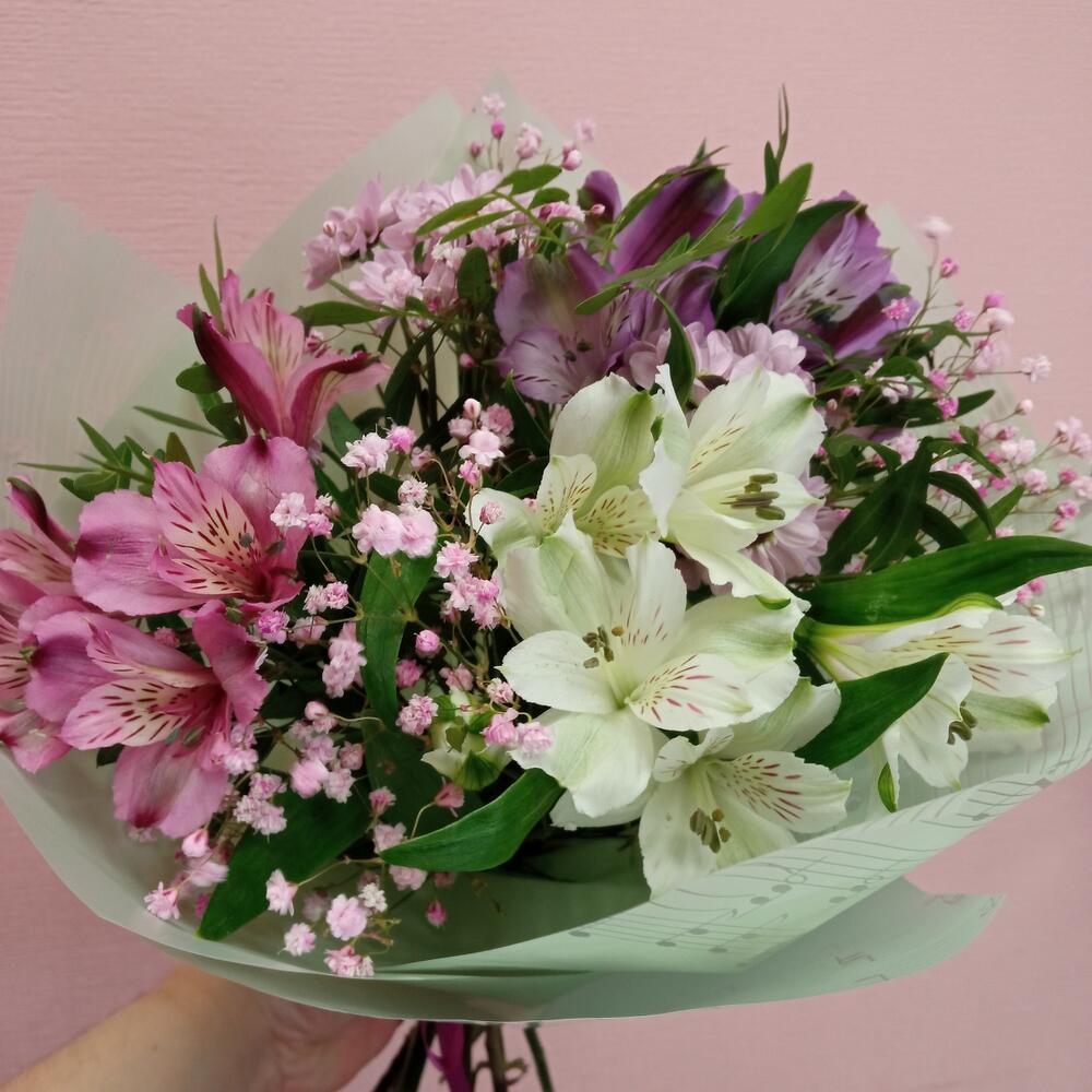 Альстромерия – 3 шт.Хризантема Сантини – 4 шт.Упаковка – 1 шт.Лента атласная – 1 шт.зелень декоративная – 2 шт.гипсофила радужная – 1 шт.