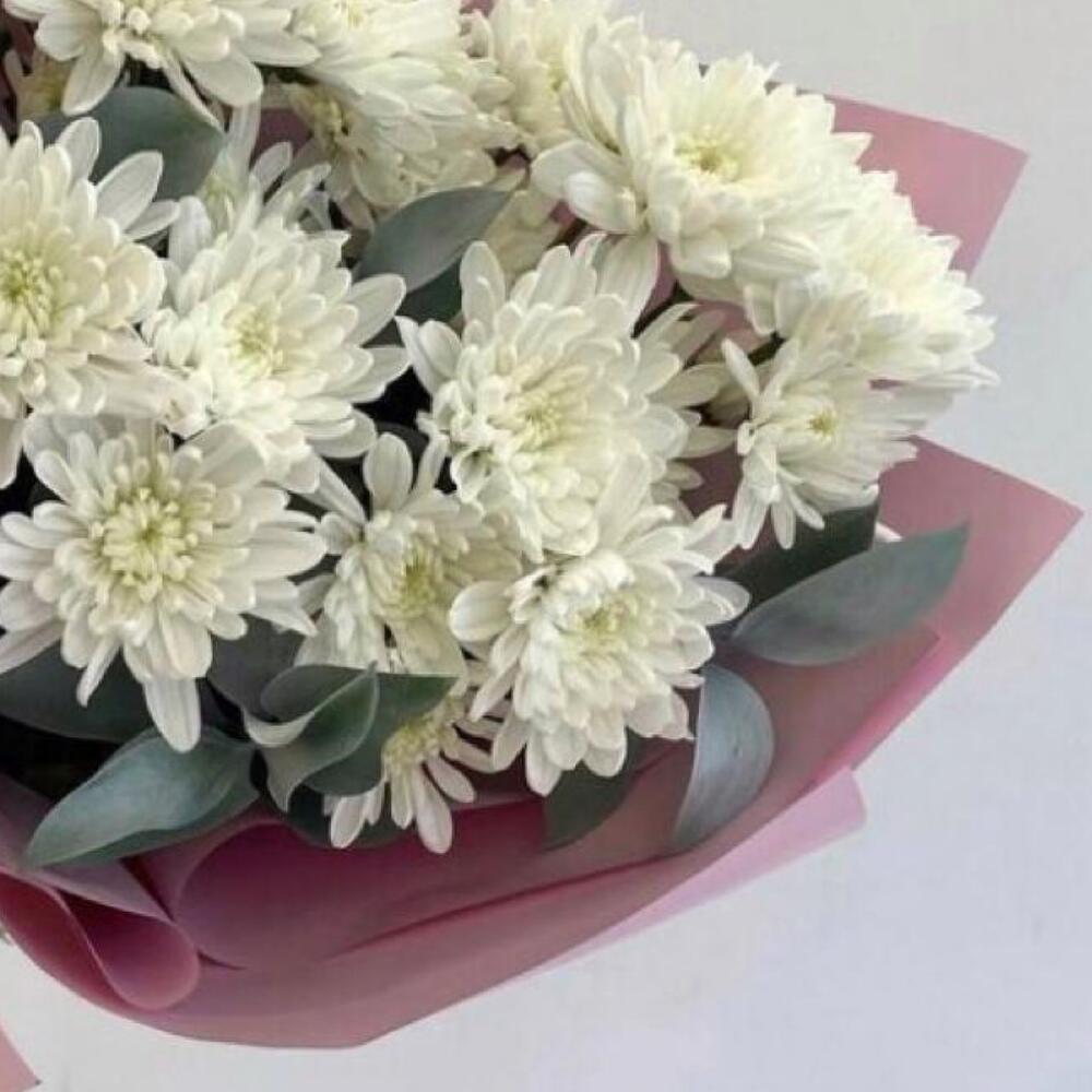 Рускус – 5 шт.Хризантема кустовая – 5 шт.Лента атласная – 1 шт.