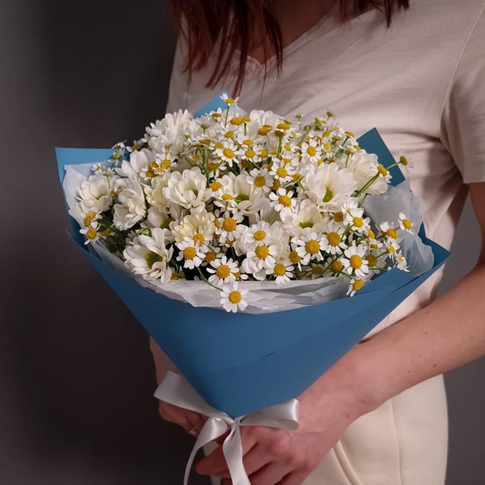 Упаковка дизайнерская – 1 шт.Аквапак – 1 шт.подкормка для срезанных цветов – 2 шт.ромашки кустовые – 6 шт.хризантема сантини росси вайт – 5 шт.