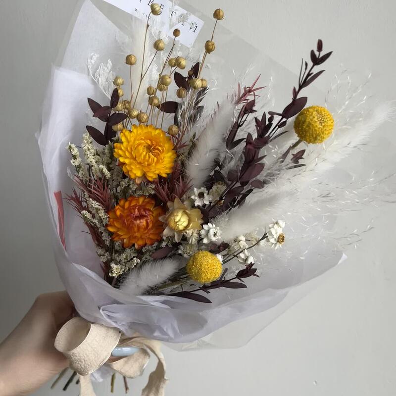 Упаковка дизайнерская – 1 шт.Гелихризум – 3 шт.Краспедия – 2 шт.аммобиум – 1 шт.Лагурус – 7 шт.Лен – 1 шт.Эвкалипт – 1 шт.пампасная трава – 1 шт.