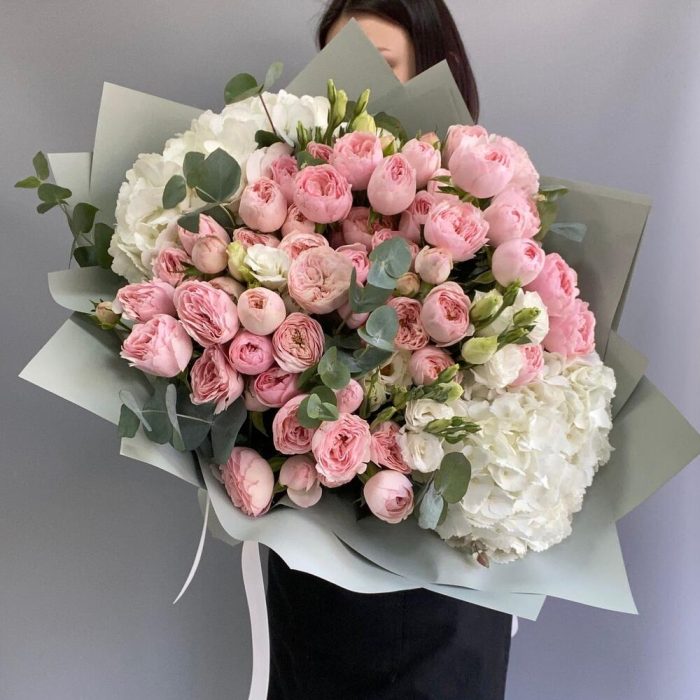 Авторский букет с ароматными розами и гортензией «Тайное влечение»