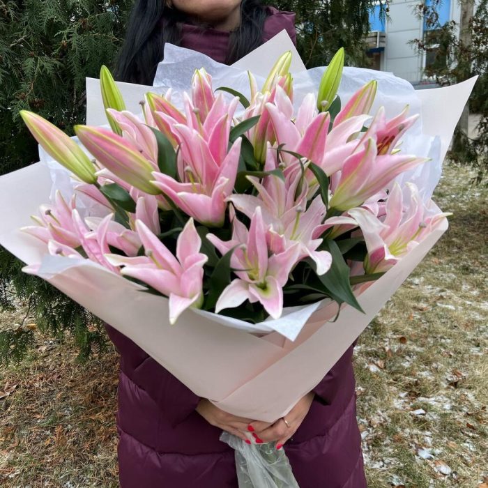 Тишью – 3 шт.лилия ориентальная розовая – 7 шт.структурированный фаомиран – 3 шт.