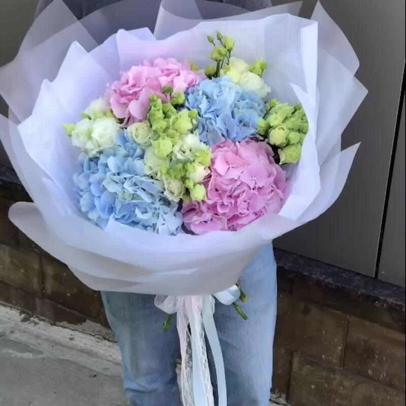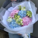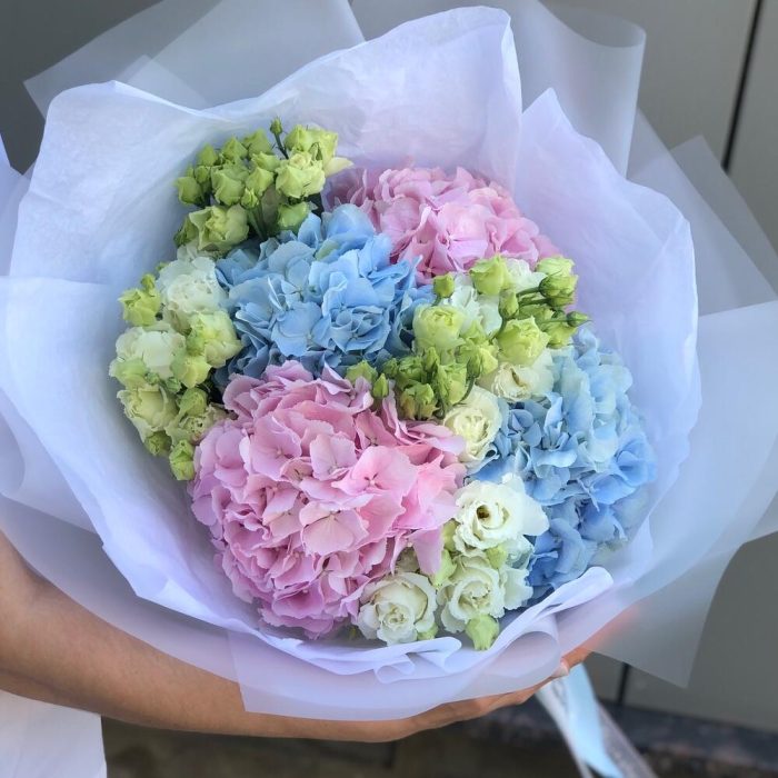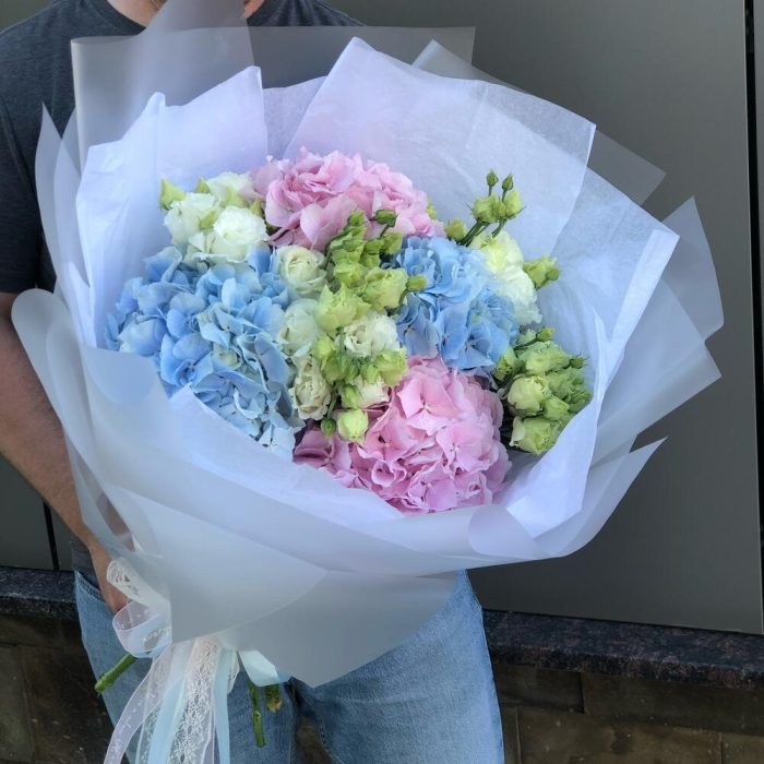 Гортензия – 4 шт.Эустома – 5 шт.Тишью – 4 шт.Упаковка дизайнерская – 6 шт.лента премиум – 2 шт.