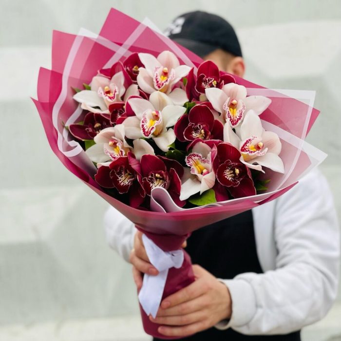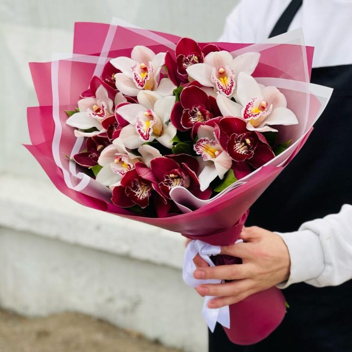 Орхидея Цимбидиум – 15 шт.Рускус – 15 шт.Лента атласная – 1 шт.Упаковка дизайнерская – 5 шт.удлинитель для орхидеи – 15 шт.