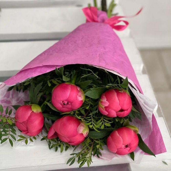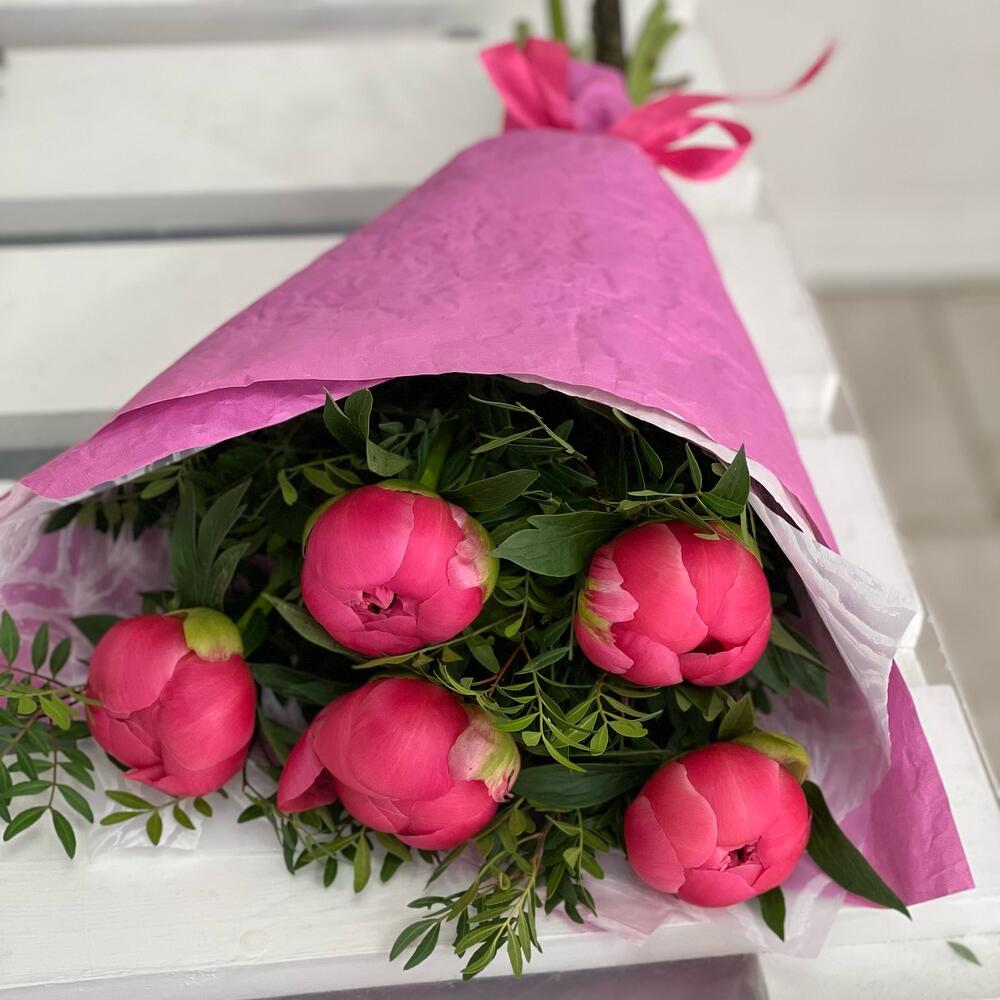 5 коралловых пионов с зеленью и оформлением