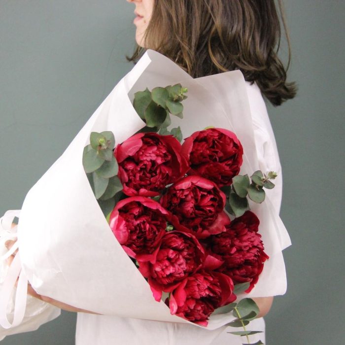 Алый – букет из пионов и эвкалипта