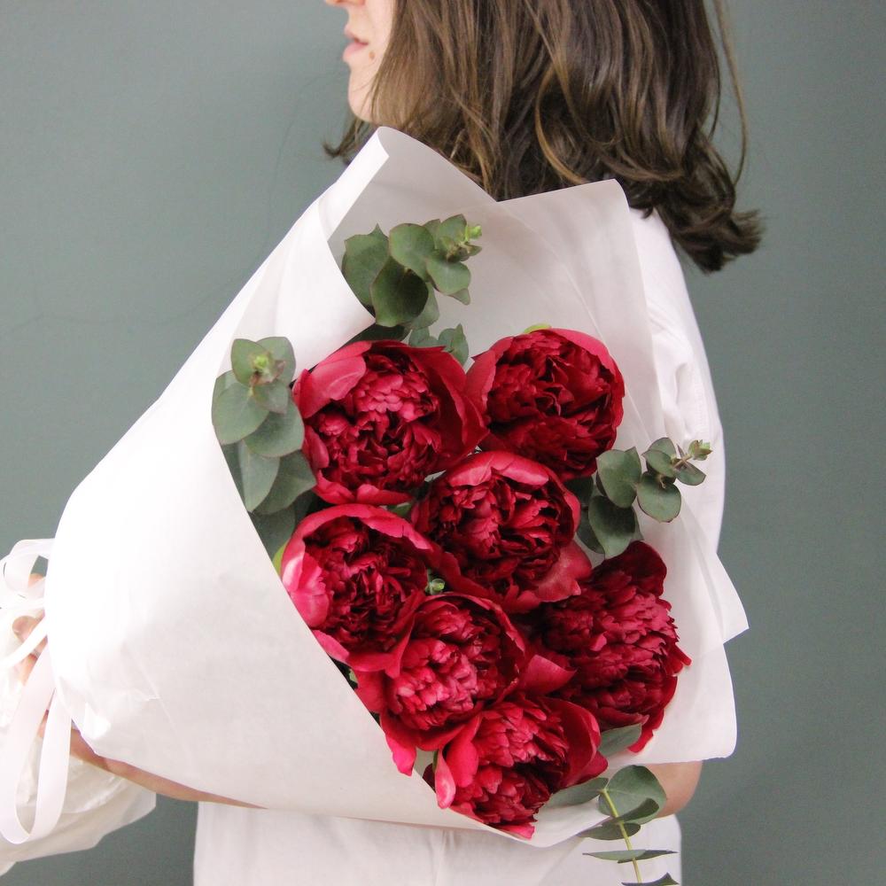 Алый - букет из пионов и эвкалипта
