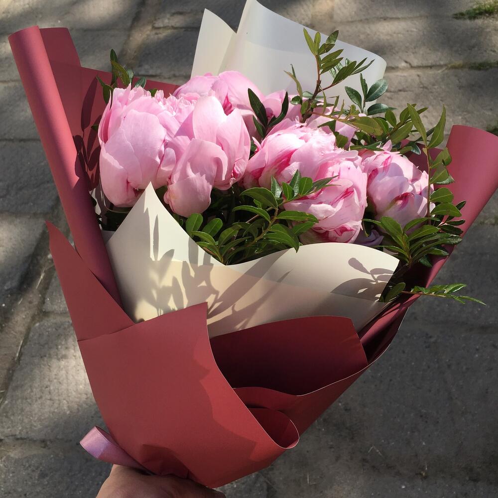 Пион – 5 шт.Писташ – 3 шт.Лента атласная – 1 шт.Упаковка дизайнерская – 3 шт.