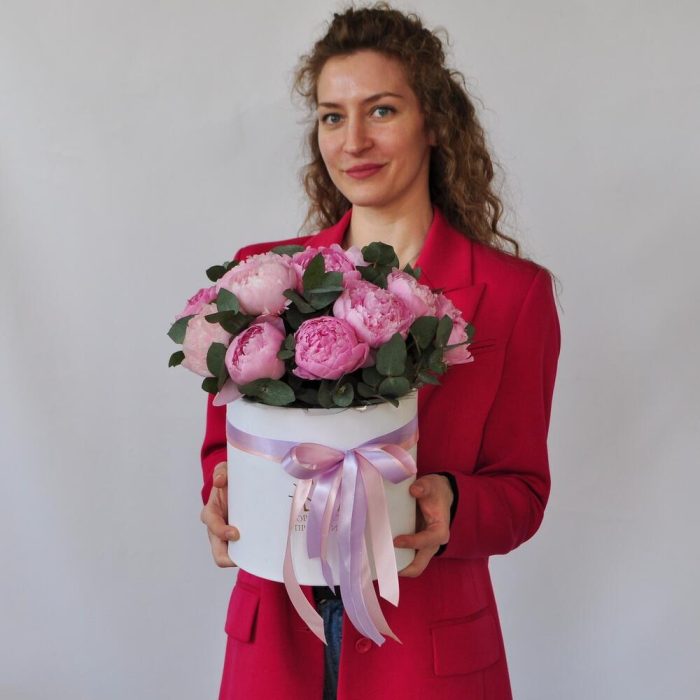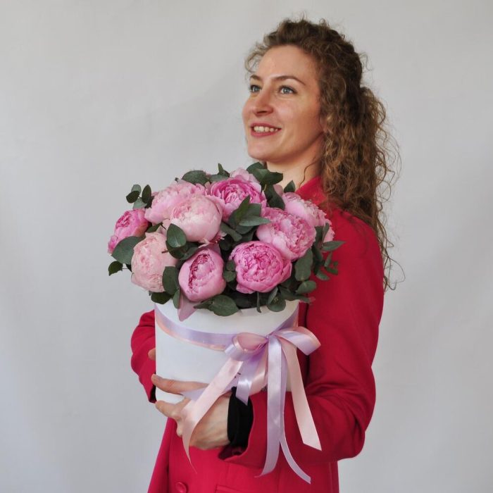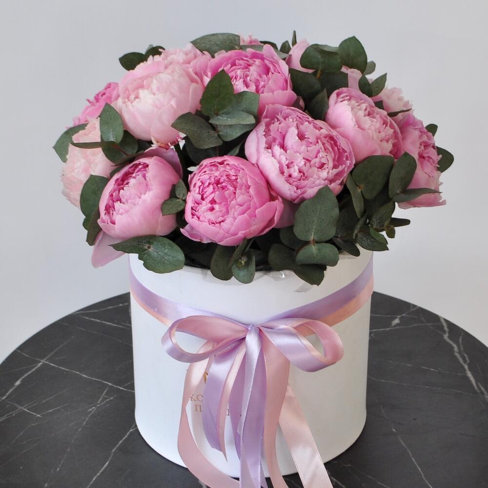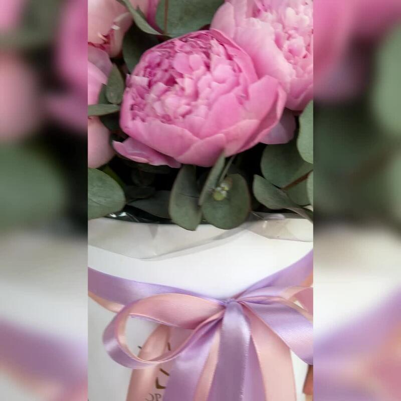 Эвкалипт – 1 шт.Коробка шляпная – 1 шт.Пион Сара Бернар – 15 шт.Оазис флористический – 2 шт.