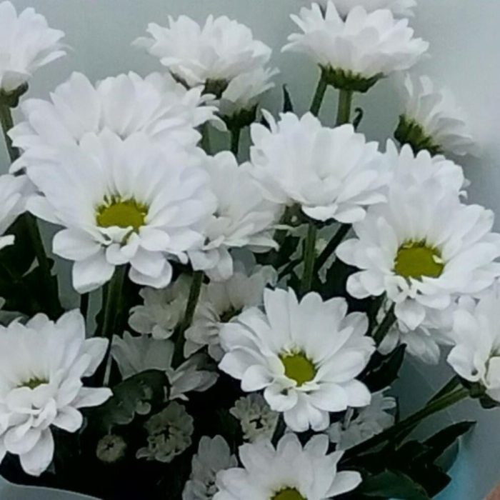 Лента атласная – 1 шт.Упаковка дизайнерская – 1 шт.сантини ромашка белая – 3 шт.