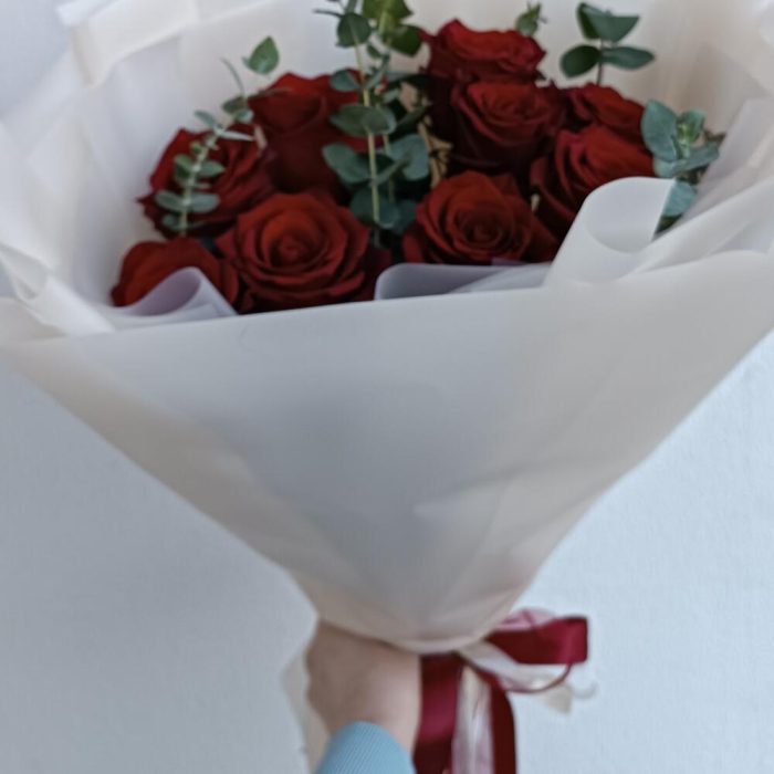 роза эквадор 70 см красная – 9 шт. Эвкалипт Микс – 3 шт. Упаковка дизайнерская – 1 шт.
