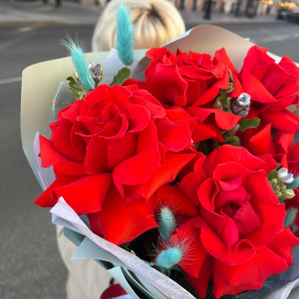 Букет из красных роз«Алый закат» (розы красные французские, эвкалипт)