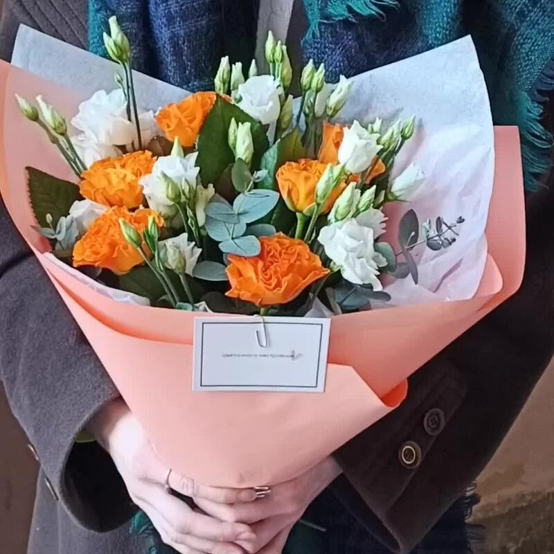 Эвкалипт – 1 шт.Лизиантус белый – 2 шт.Авторская упаковка – 1 шт.роза россия оранжевая – 7 шт.
