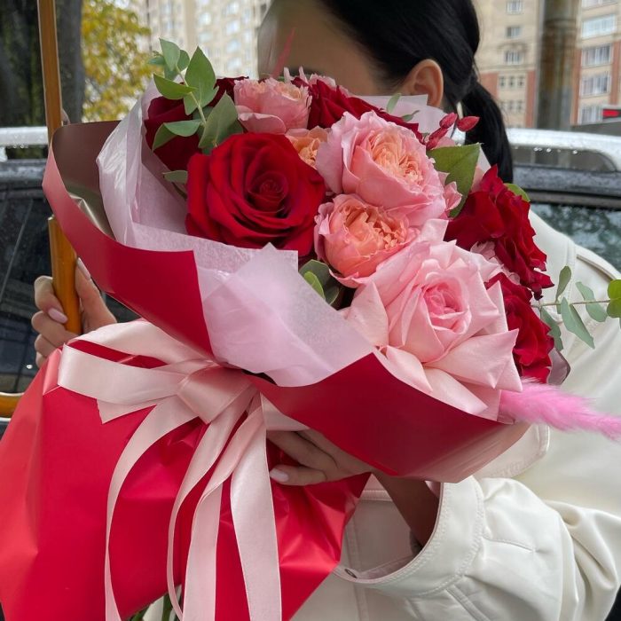 Лента атласная – 2 шт.Тишью – 4 шт.Пионовидная роза – 2 шт.Салал листья – 4 шт.Сухоцвет – 5 шт.Пленка матовая – 4 шт.красная роза 60 см – 5 шт.white o’hara – 1 шт.