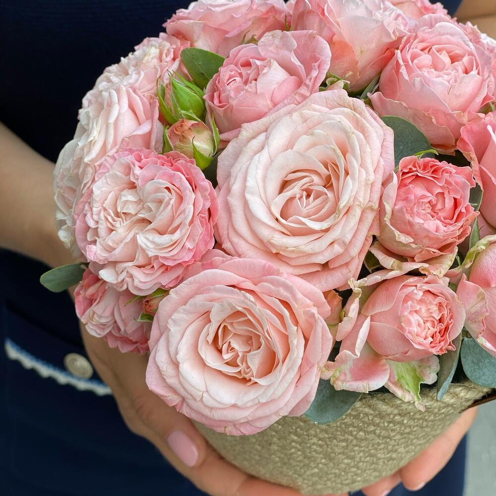 Эвкалипт пучок – 1 шт.Оазис флористический – 1 шт.роза кустовая сорта мадам бомбастик – 5 шт.кашпо джутовое ручной работы – 1 шт.