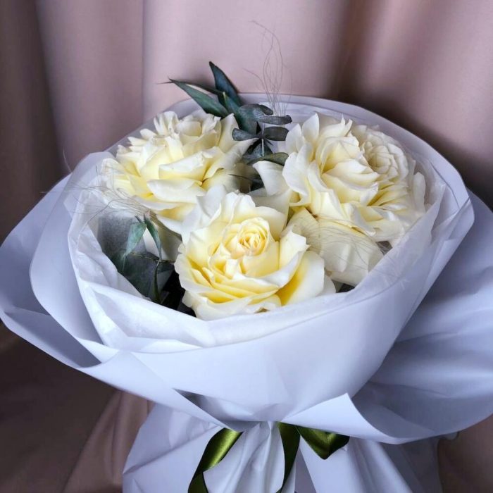 Эвкалипт – 3 шт.Лента атласная – 1 шт.Роза французская – 3 шт.Ковыль – 3 шт.пленка флористическая – 3 шт.подкормка для стойкости цветов – 1 шт.открытка для пожеланий – 1 шт.