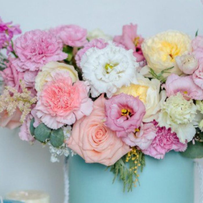 Роза одноголовая – 7 шт.Лизиантус алиса – 4 шт.Диантус – 7 шт.Роза кустовая – 2 шт.ветки эвкалипта – 2 шт.Маттиола – 2 шт.коробка шляпная размер l – 1 шт.